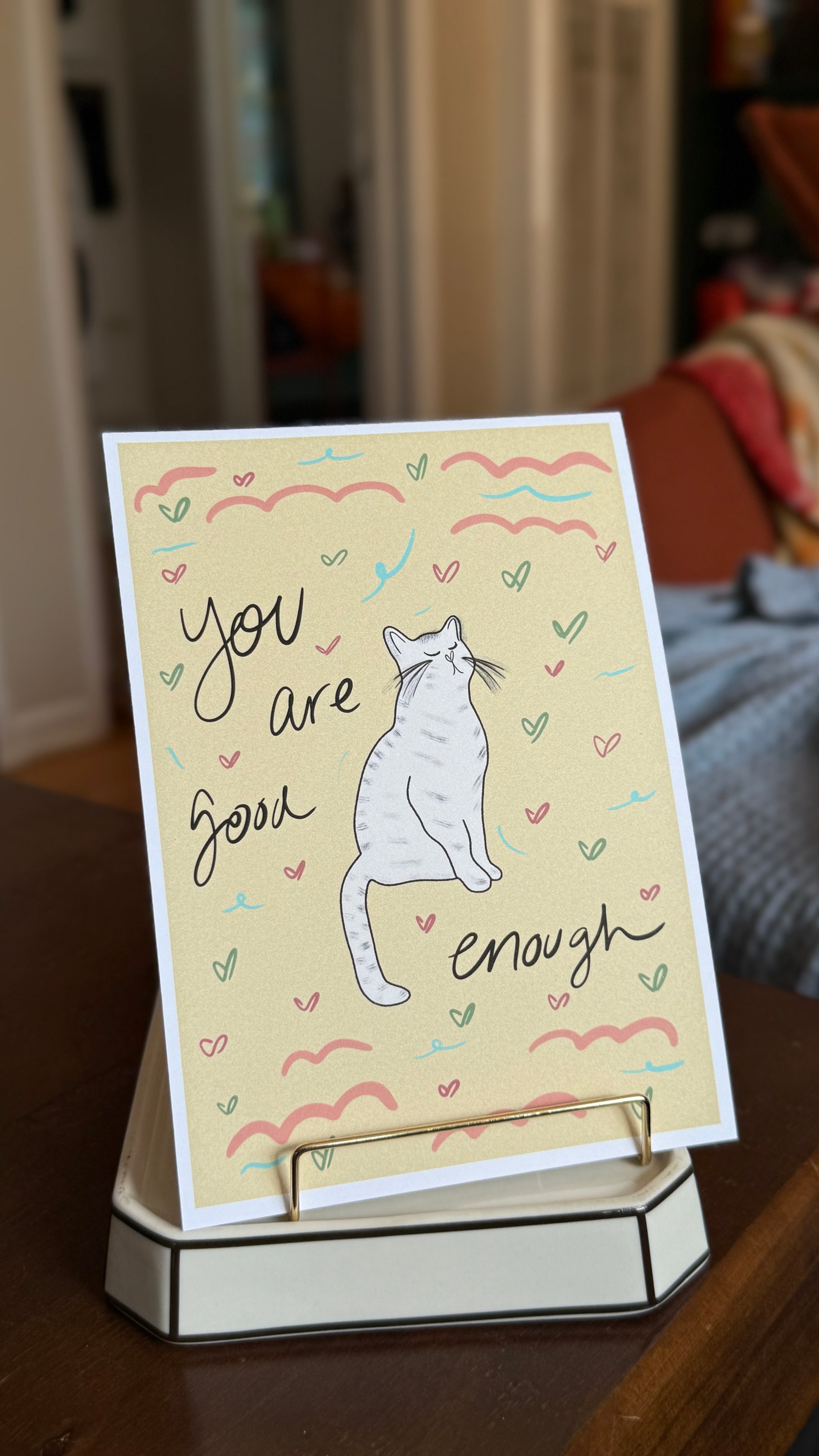 This print serves as a gentle reminder that you are good enough! The inspiration came from our soul cat Al Dente & how much love he shared with his kind meows.